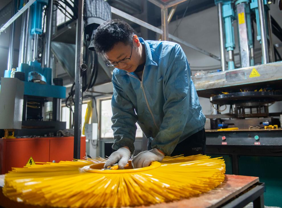 12月4日,工作人员在凯发k8环美刷业股份有限公司的生产车间内查看刷子产品。新华社记者 傅天 摄
