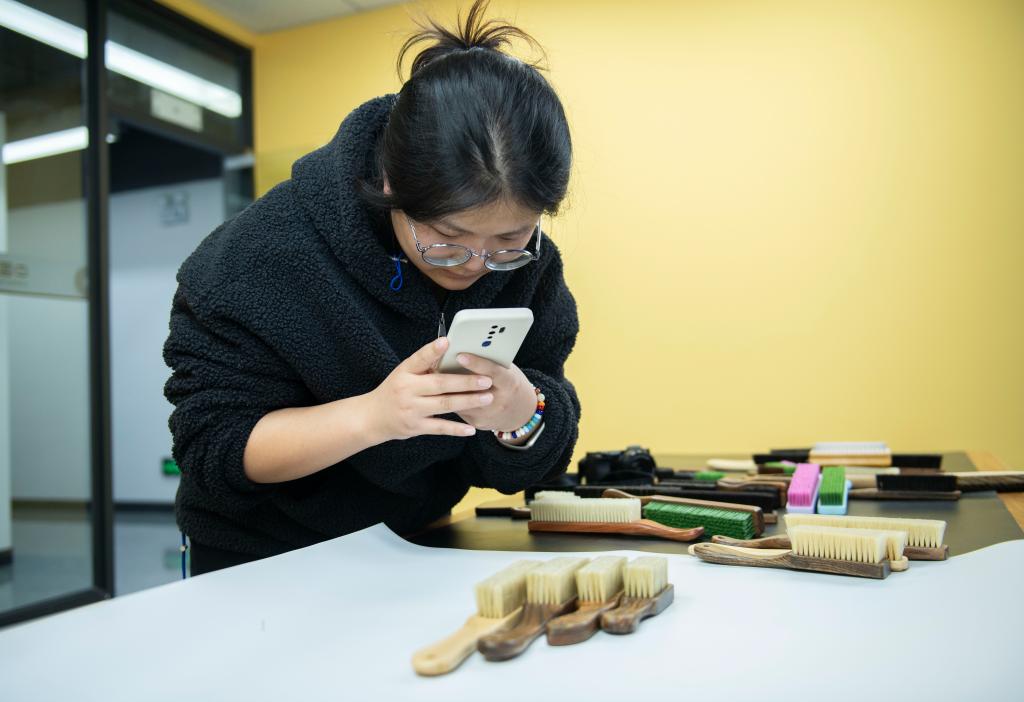 12月4日,工作人员在中国刷业跨境电商产业园工作间内拍摄刷子产品。新华社记者 傅天 摄